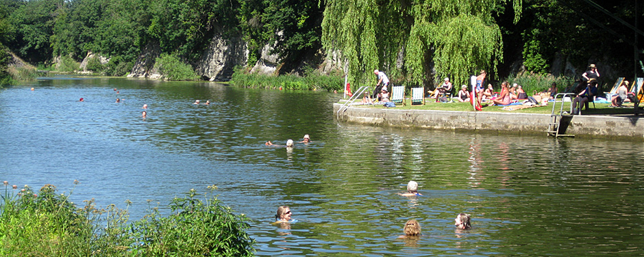 Situated in the heart of the Bristol suburb of Henleaze, only a mile from the Downs and three miles from the city centre, this former quarry is surrounded by lawns and beautiful trees. The Lake is about four hundred metres long and between thirty and sixty metres wide. The swimming area varies throughout the year; from 70 metres in the winter to 220 metres in high summer.